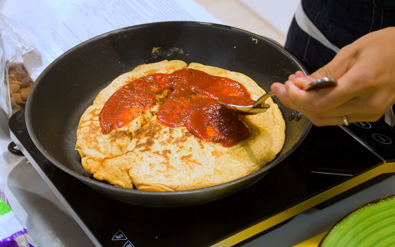Stendi l’impasto in una teglia da forno coperta con carta forno e spennellata di olio e lascia cuocere per circa 20 minuti a 180°. Oppure, se preferisci, puoi cuocere l’impasto in una padella antiaderente con un filo di olio, procedendo come per realizzare una crespella, facendo dorare bene su entrambi i lati.